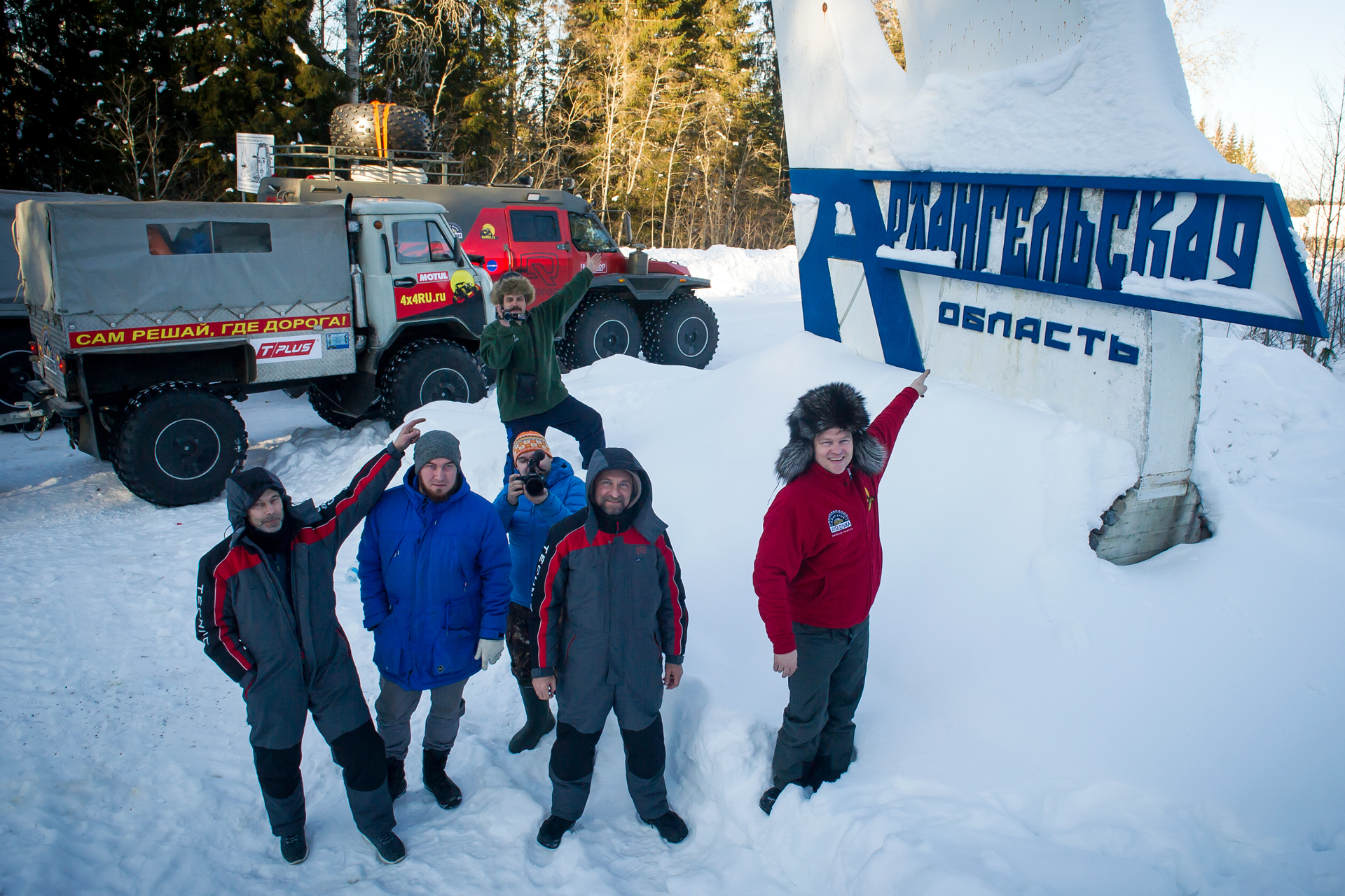 An early rise, apparently, will be during the whole expedition. We cheerfully drove up to Belozersk, sometimes going at a speed of 70 km/h. Then we went to Kargopol, using the shortcut, of course, as we were riding the all-terrain vehicles. However, in winter the road here is excellent and hard , but a little bit narrow - it is difficult to pass each other with oncoming cars. We took a group photo near the stele "Arkhangelsk region" - slowly but surely moving towards the goal! By evening we reached Kargopol, now we are refueling all the cars, since the last time we did it was a long time ago. It’s getting dark now, and we still have to go and go to stay on schedule. Wish us a happy journey!