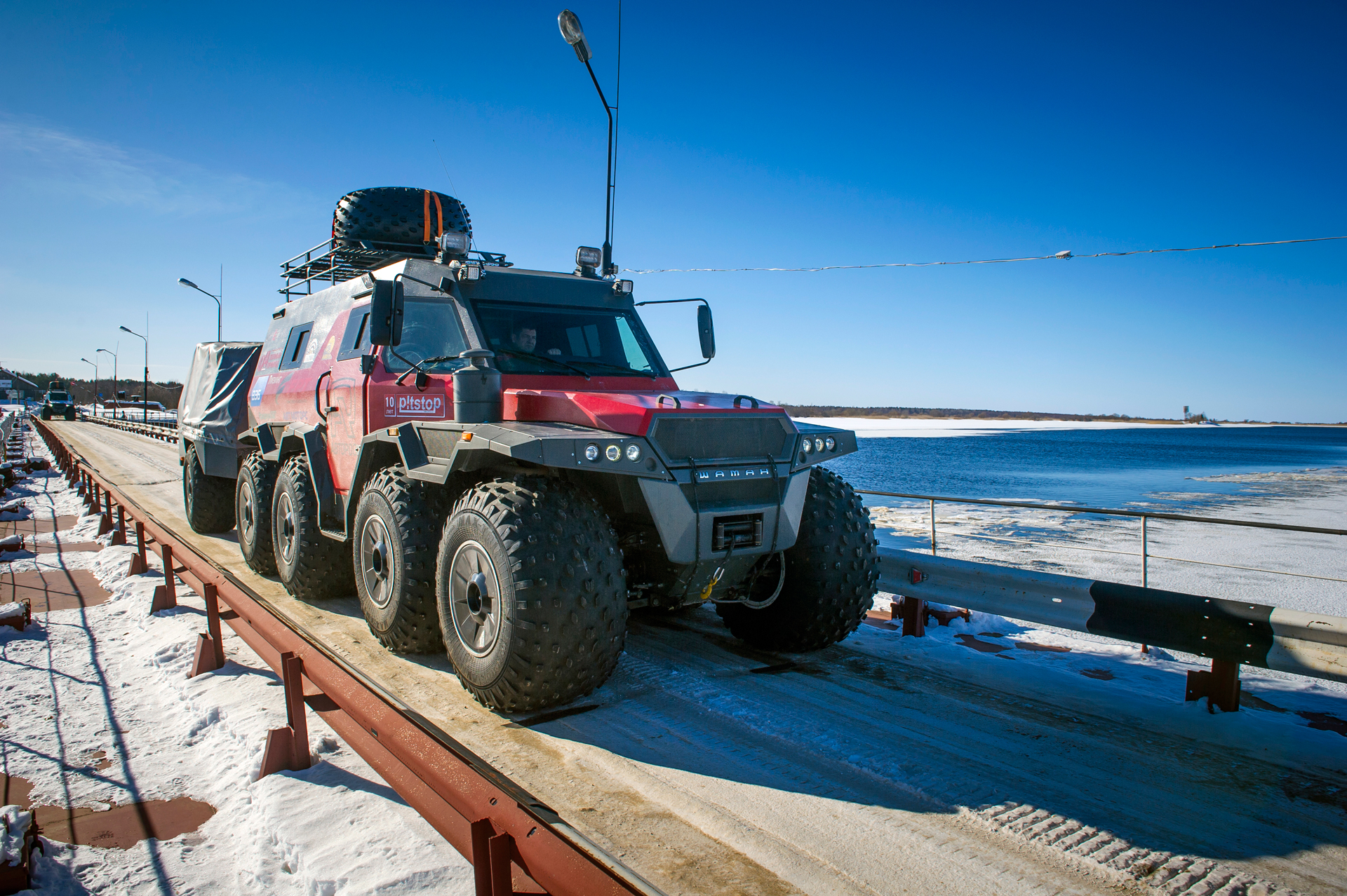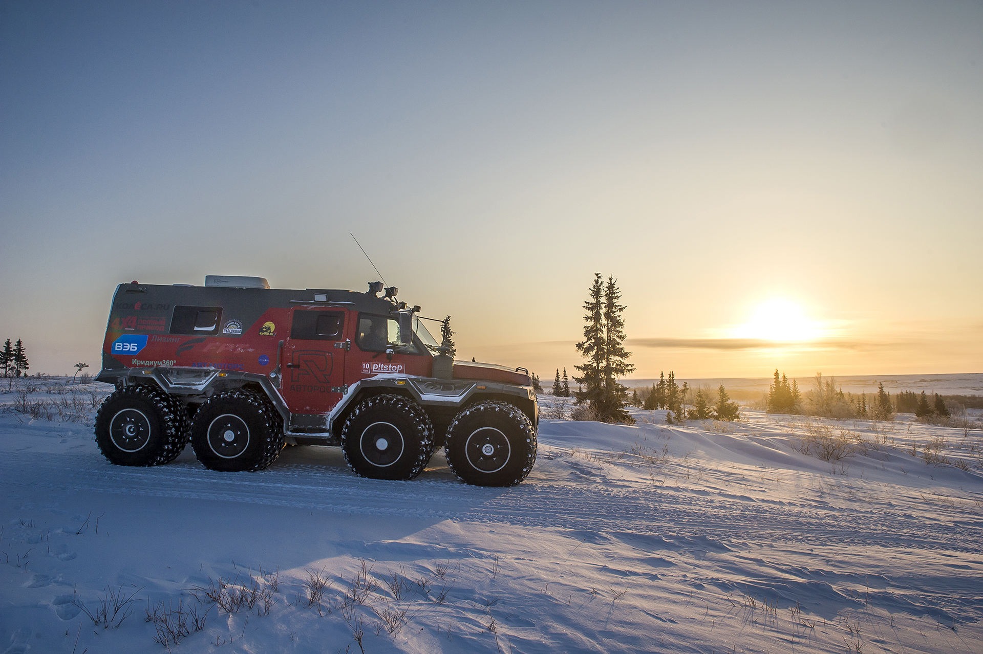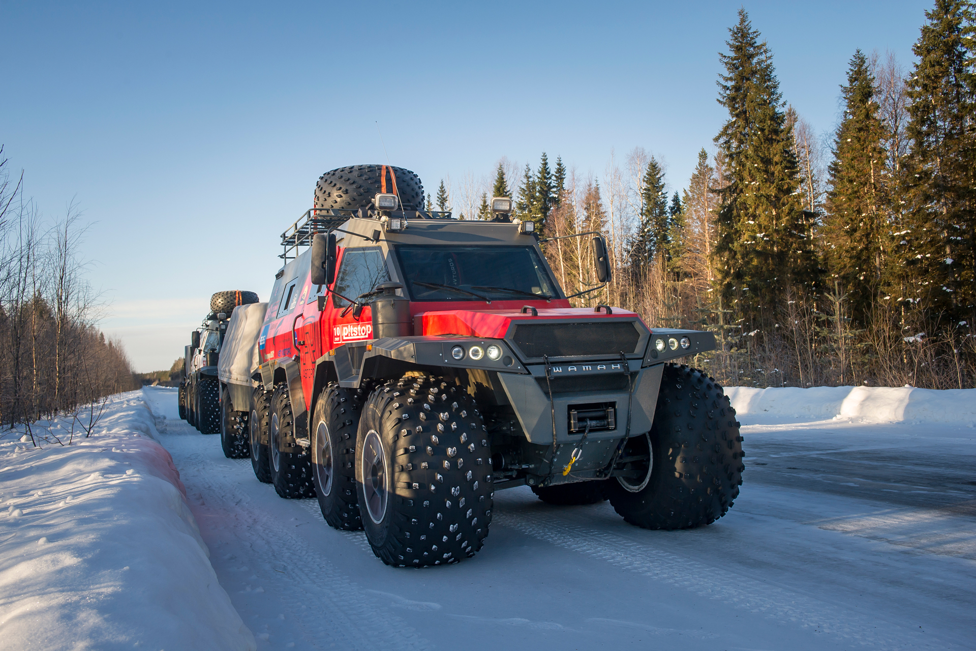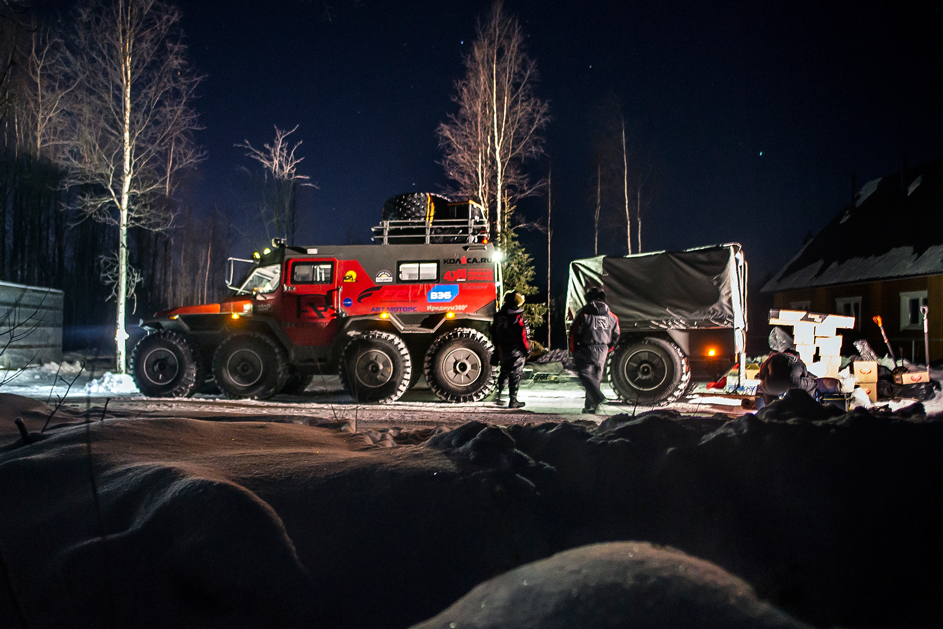 The first hundred kilometers we traveled in a strong snowstorm, snow swept the road and covered the windshield, the wipers were freezing, but after Bezhetsk the weather improved. In Vologda Region, the roads were covered with ice, but all-terrain vehicles rode along them quite confidently, thanks to the the weight of the cars and the number of wheels. The motorcade was headed by Pavlov’s “tadpole”, followed by a crew of mechanics, and a crew of journalists closed a small motorcade. We were driving together, although not fast: cruising speed was about 55-60 km /h. There were still more than 1,000 km ahead - the expedition was still at the very beginning.