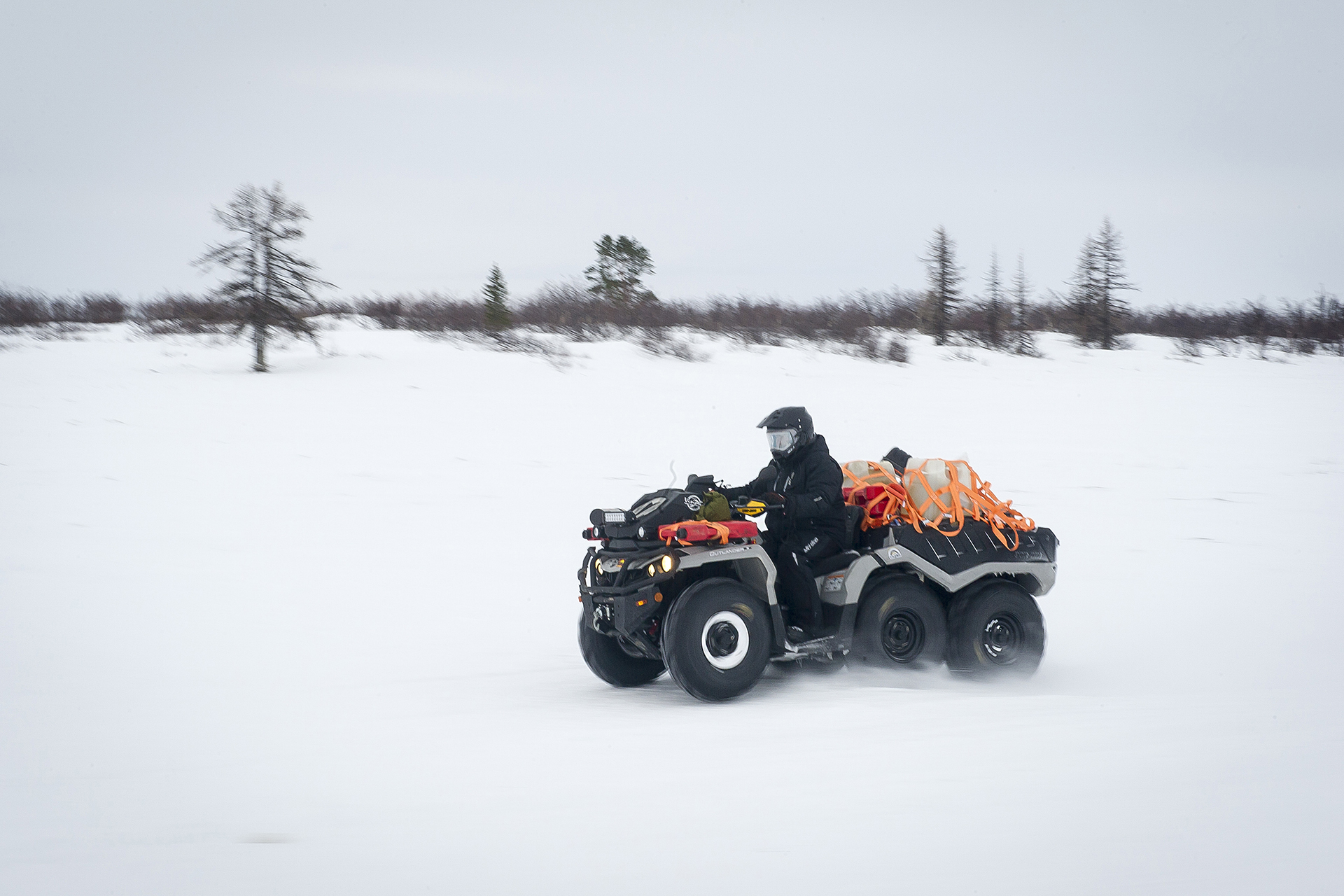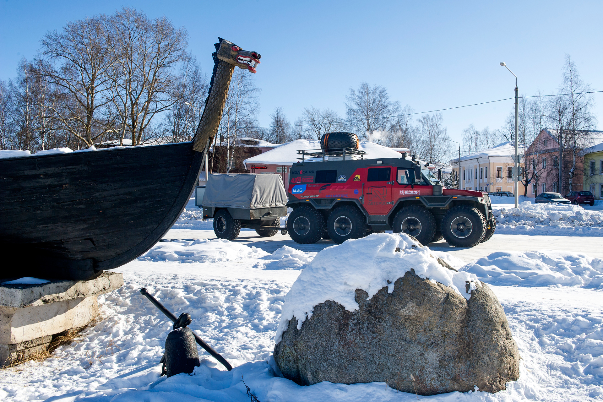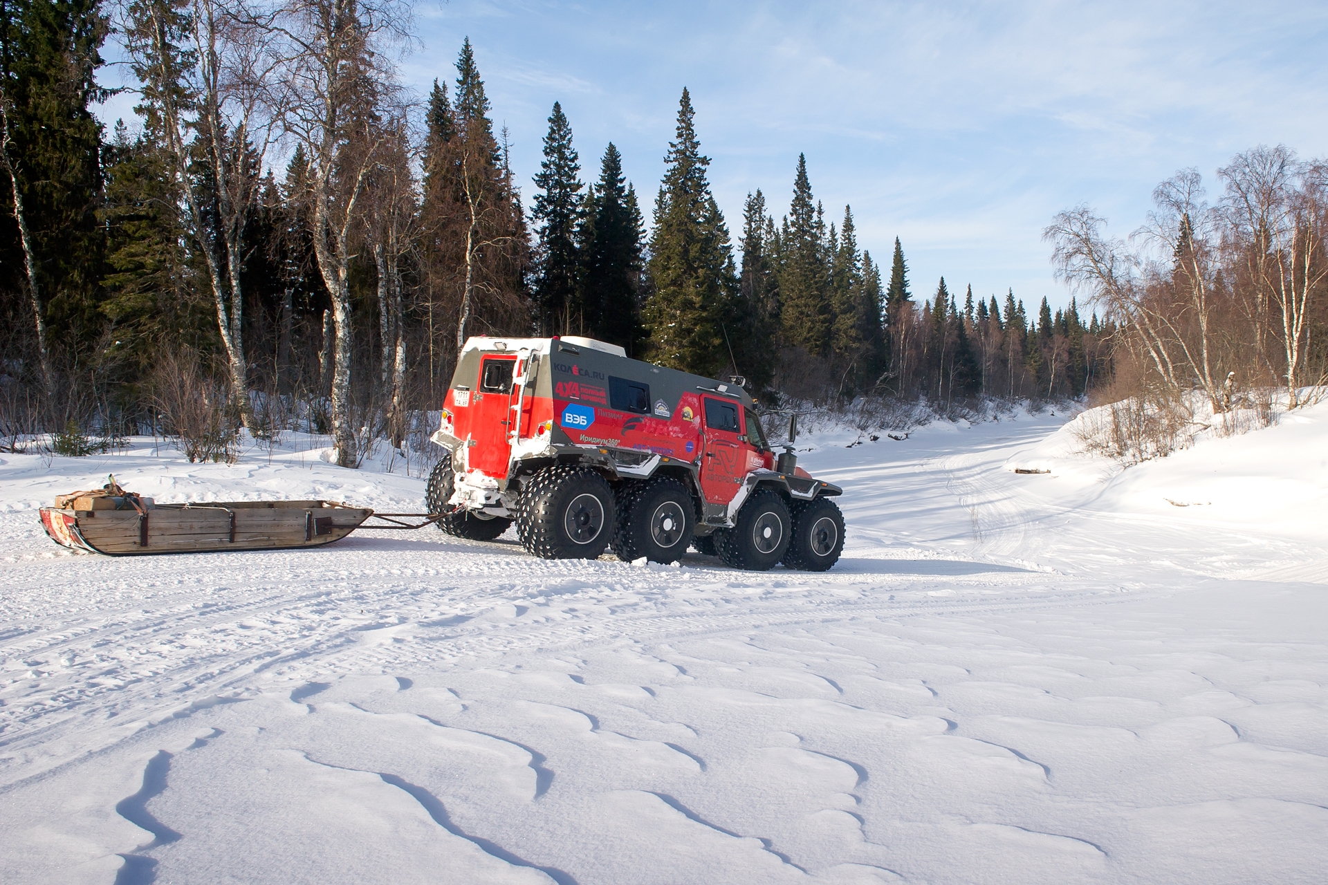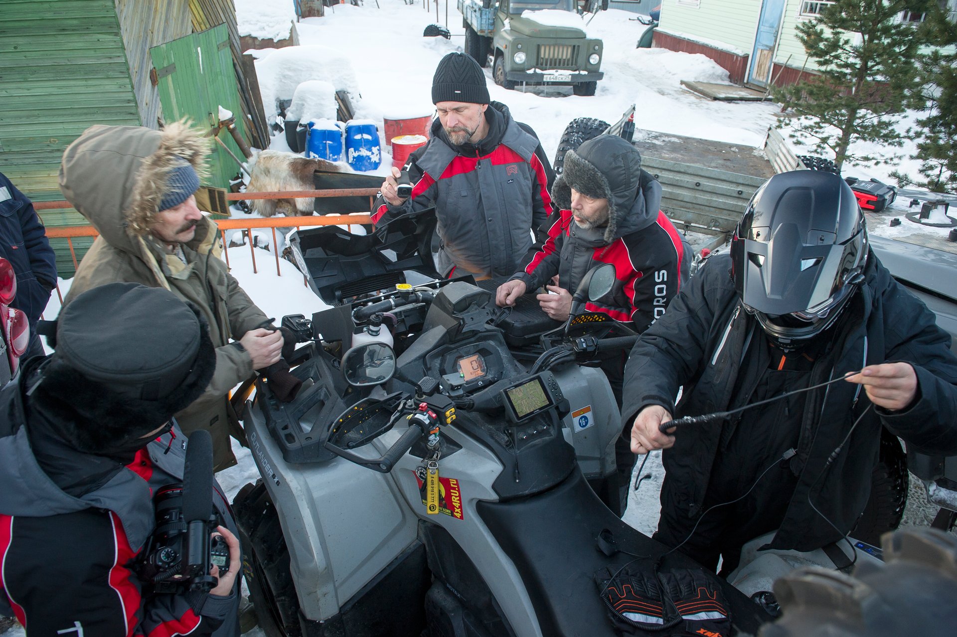 Our expedition had a short delay near Arkhangelsk. We purchased some more groceries, fresh vegetables and gifts. The red SHAMAN returned from Arkhangelsk, where he went to the gas station for refueling, and also filled two 200-liter barrels of gasoline - for Yevgeny Pavlov’s quad bike . Finally, the “Red One” came back and they hurriedly set off.