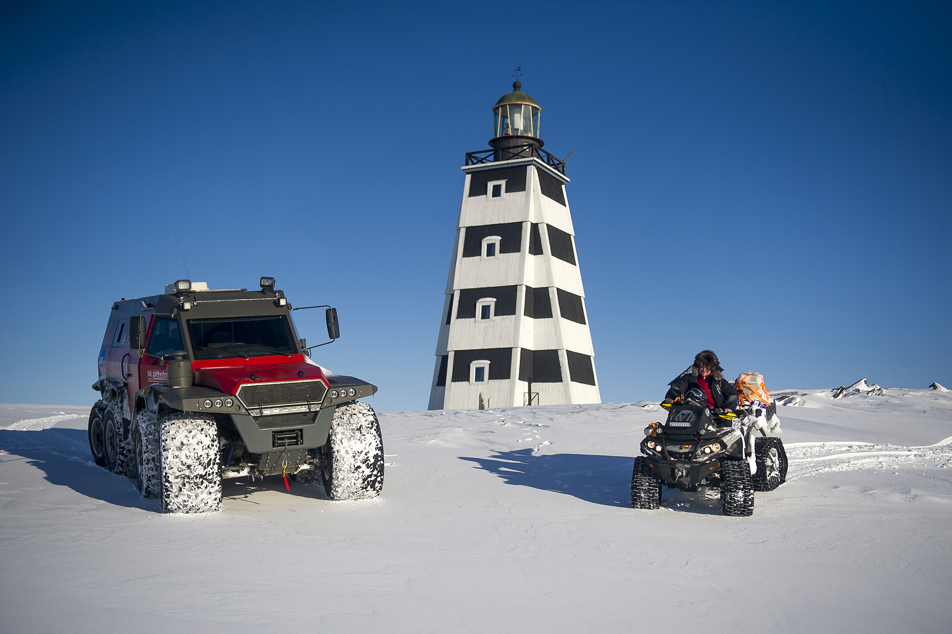 We arrived at Canin Nos! The day before, on March 12 at 5 o’clock in the morning we reached the lighthouse. People and the equipment made it! The road from Shoyna was not particularly difficult, but the biggest part of the trip was made in full darkness and it was not easy to navigate, but there was a navigator! The ice on the rivers was strong - we moved without any problems, although at first there were thoughts of moving away from the sea in order to move to the other shore more safely. Then we drove out to the ice of rivers and streams without fear. We heard about the crevices covered by snow, but somehow we did not notice them. But Shaman got stuck in soft fluffy snow a couple of times, in spite of his big wheels, however, with the help of the quad bike, used as an anchor for the rear winch, it was easy to get out of the trap. The most difficult place was a steep climb right after the Bolshaya Bugryanitsa river. The Shaman overcame this climb in a few steps, starting from the trodden track.