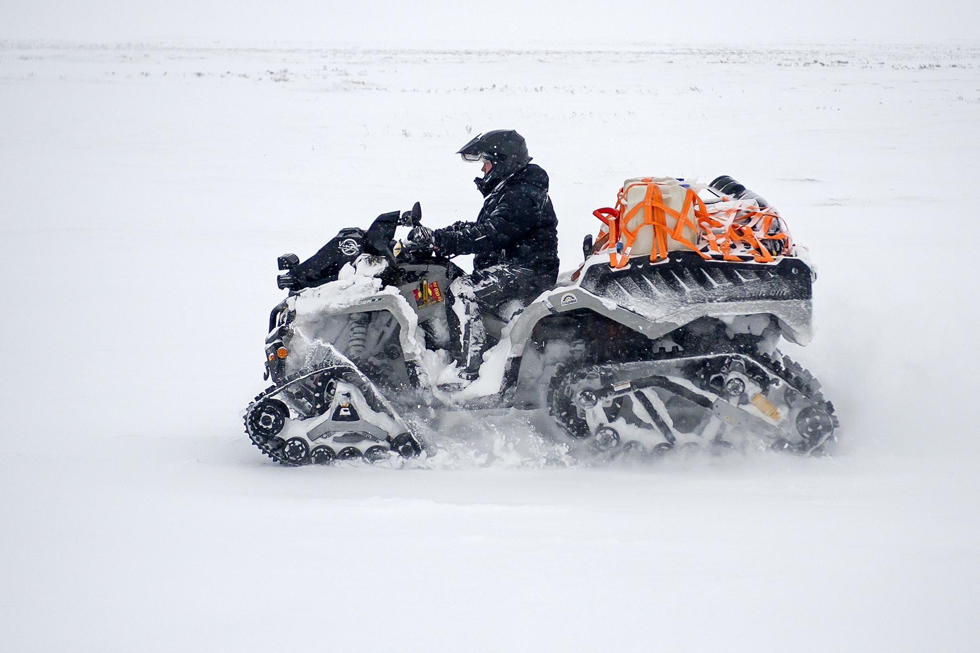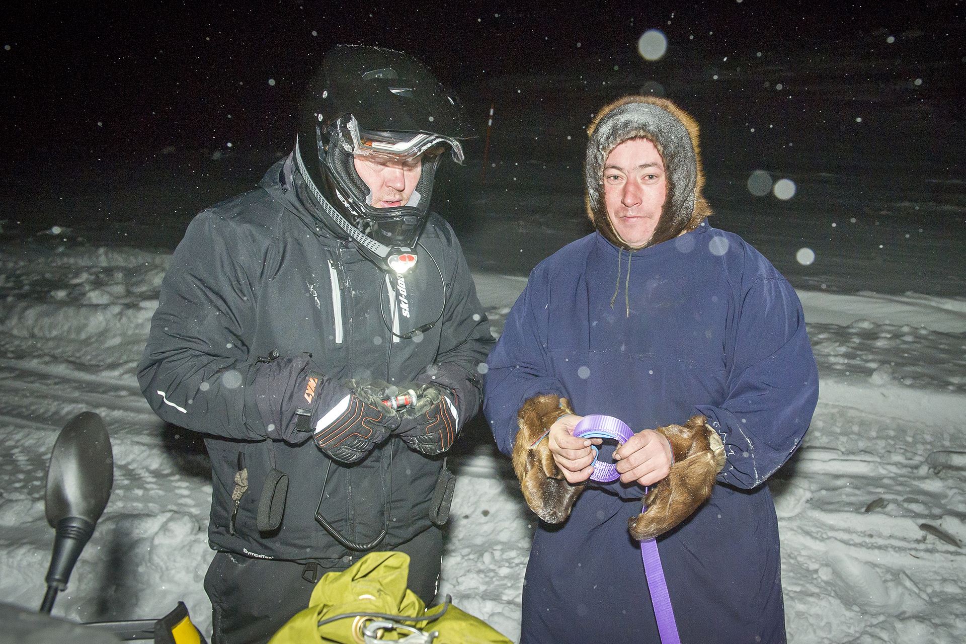 In Shoyna the team had to stay for half a day instead of an hour or two, as it was originally planned. The reason was a breakdown of a quad bike. The variator belt should last for a long time, but when riding on the tracks, the transmission load is much higher than on wheels, so the belts are easily broken. That was the third broken belt for the trip, and the last one of the spare belts remained in Kamenka. The spare belt should have been brought by a passing snowmobile. But still we waited for a long time. Finally we got the spare belt, fixed the quad bike and drived on, as the night was just around the corner.