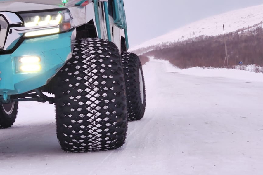 На вездеходе уже установлена оригинальная раздаточная коробка и оригинальные шины AVTOROS на собственных легкосплавных дисках размером 19х21 дюйм.