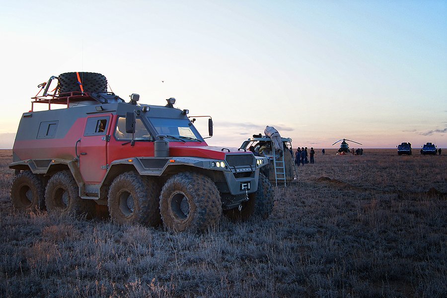 Сотрудники компании "АВТОРОС" на вездеходе "ШАМАН" приняли участие в спасательной операции спускаемого аппарата "Союз МС-06". Задача экипажа заключалась в доставке к месту спуска аппарата съемочной группы Центра Управления Полетами, которая передает видео в прямом эфире.
